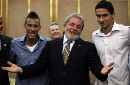 | Ganso (phải) bên cạnh tổng thống Lula và thần đồng Neymar. |