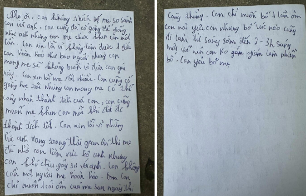 Con xin lỗi vì những lúc anh đang trong thời gian ôn thi, mẹ đã nhờ con làm việc hộ anh nhưng con khó chịu gây sự với anh. Con không cần một người mẹ hoàn hảo. Con chỉ muốn một cái ôm của mẹ sau ngày thi căng thẳng. Con chỉ muốn bố một lần ôm con, nói yêu con nhưng bố lúc nào cũng đi làm từ sáng sớm đến 2-3h mới về nên con không dám làm phiền. Con yêu bố mẹ".