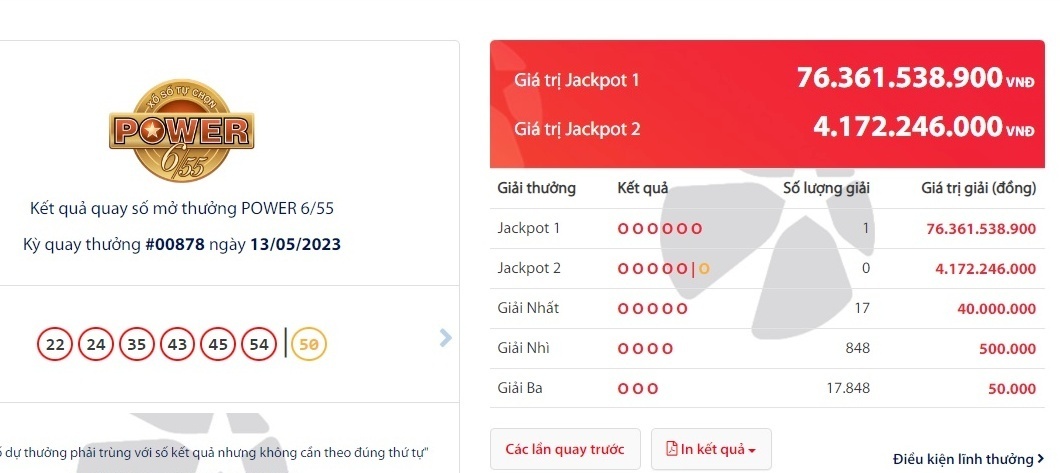 Tối 13/5, Công ty Xổ số Điện toán Việt Nam (Vietlott) – Bộ Tài chính phát đi thông báo có 1 tấm vé trúng Jackpot 1 (độc đắc) trong kỳ quay 00878 của sản phẩm Power 6/55 trị giá hơn 76,3 tỷ đồng.