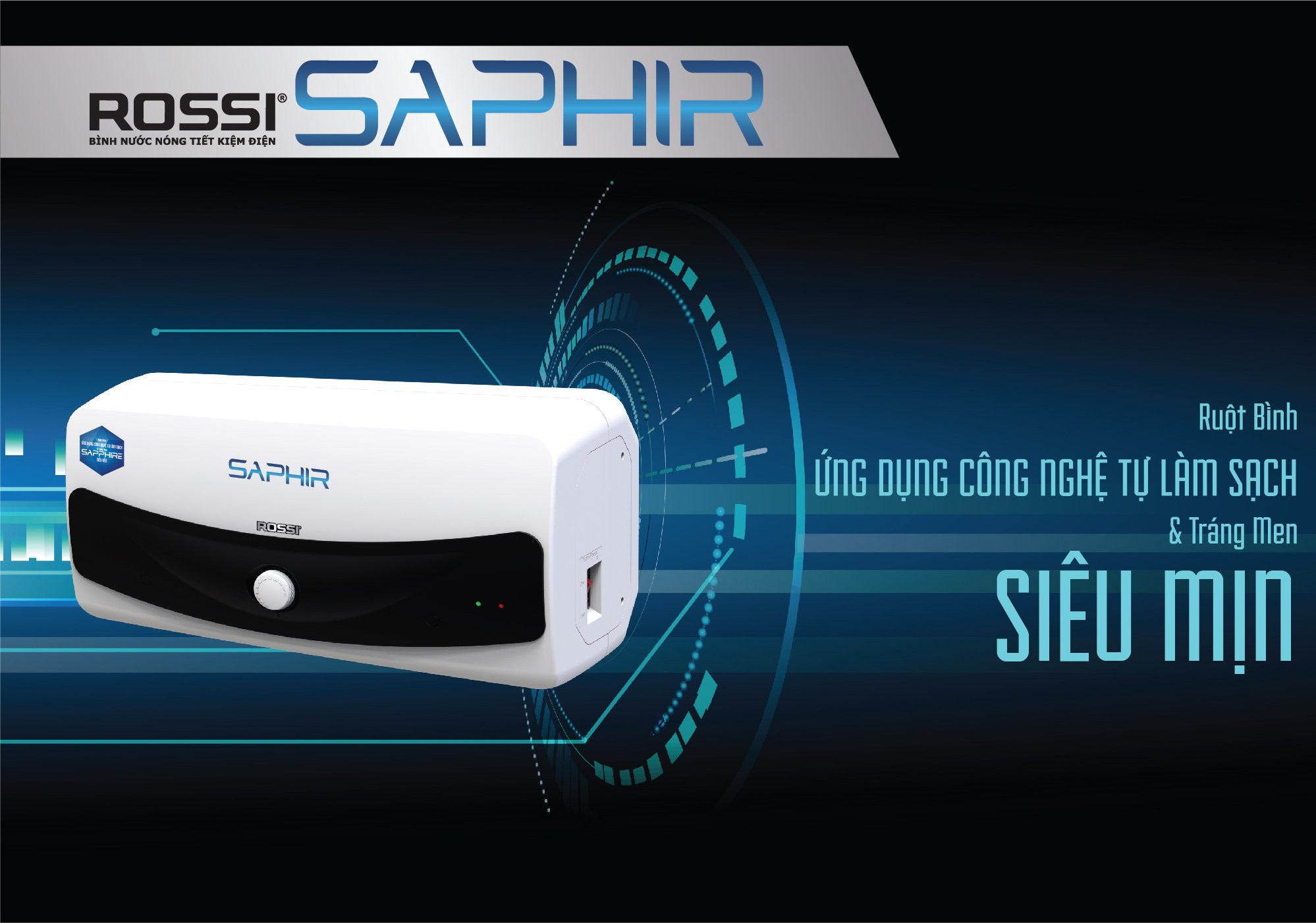 Bên cạnh đó, Rossi Saphir được đánh giá là sản phẩm bình nước nóng hàng đầu trên thị trường hiện nay với các tính năng ưu việt của bình nước nóng thế hệ mới: Thanh gia nhiệt siêu bền giúp làm nóng nước nhanh; vỏ nhựa ABS nguyên sinh chịu được độ va đập mạnh; lớp bảo ôn polyurethane nhập khẩu từ Tập đoàn Dow (Mỹ) có khả năng giữ nhiệt trong 72h; bộ chống rò điện ELCB siêu nhạy, an toàn tuyệt đối khi sử dụng. Bình nước nóng Rossi Saphir tích hợp các công nghệ và linh kiện hàng đầu thế giới: công nghệ sản xuất bình nước nóng của Ý, công nghệ tráng men của Đức, thép làm ruột bình của tập đoàn Posco - Hàn Quốc, bộ ổn nhiệt của tập đoàn Cotherm - Pháp, cọc đốt của tập đoàn Kawai - Nhật Bản.