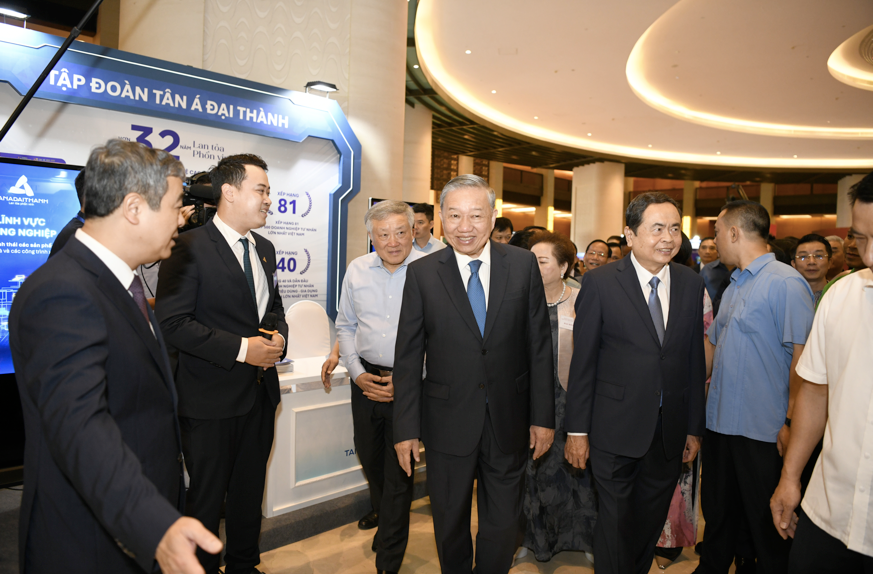 Tổng Bí thư Tô Lâm tham quan gian hàng và trao đổi, chia sẻ ý kiến với lãnh đạo của Tập đoàn Tân Á Đại Thành.