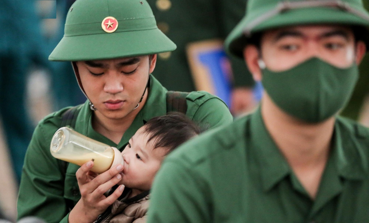 Vũ Tiến Đạt tự tay cho con bú sữa bình trước khi lên đường hoàn thành nghĩa vụ với Tổ quốc. “Con tôi mới được 9 tháng, cũng nhớ con vì trong khoảng thời gian phát triển của con mà không được ở gần chăm sóc. Ai xa gia đình cũng buồn vậy cả thôi, nhưng khoác trên vai màu áo lính mình phải rắn rỏi. Hai năm cũng không phải quá lâu”, Tiến Đạt chia sẻ.