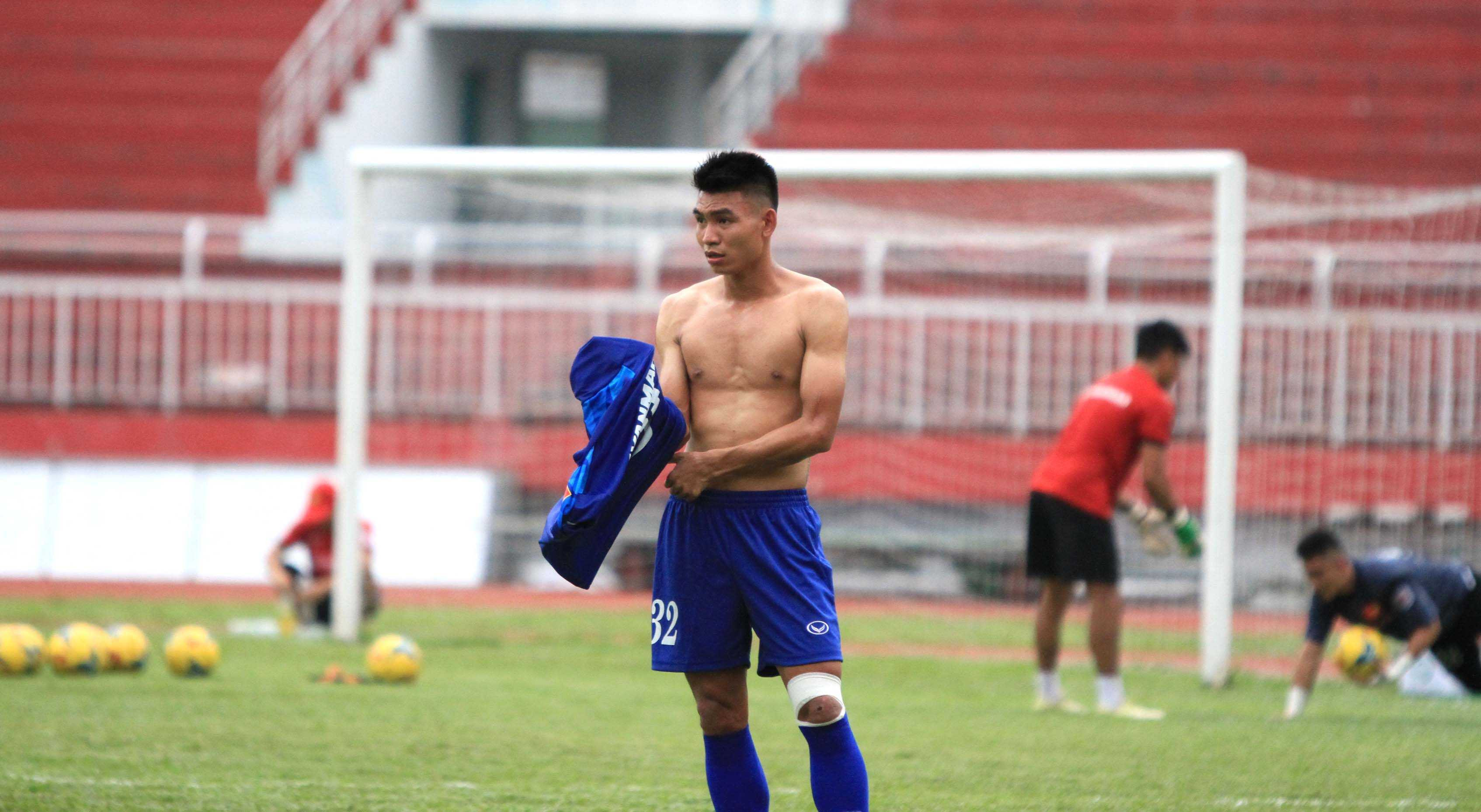 Trong buổi tập chiều qua, Quang Huy nằm trong nhóm cầu thủ tập trung muộn và được HLV thể lực Martin Forkel kiểm tra lượng mỡ thừa trong cơ thể (Ảnh: H.T)
