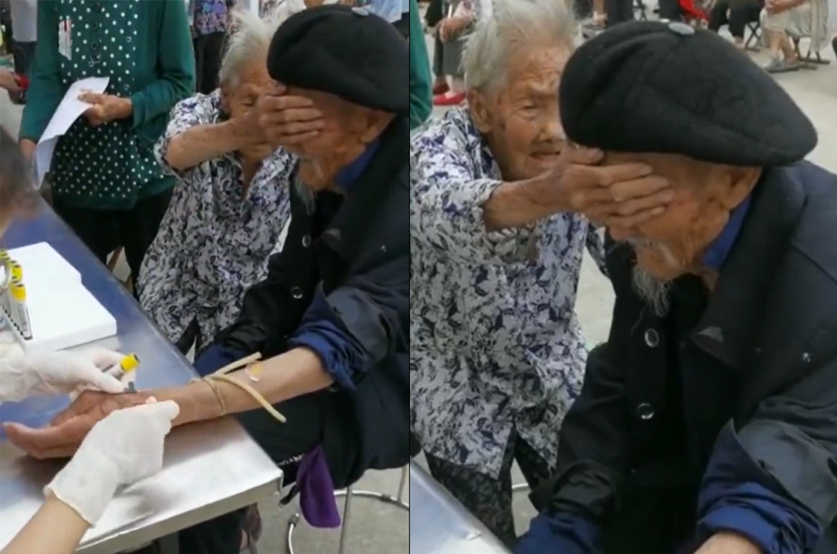 Cụ bà 100 tuổi bịt mắt cụ ông 98 tuổi khi lấy máu.
