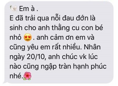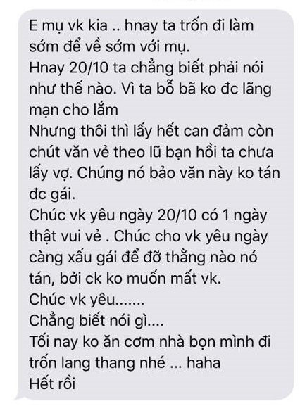 Cũng chính vì thế mà ngay sau khi tin nhắn “bá đạo” của một anh chồng vốn khô hơn cả “cơm rang quá lửa” gửi tặng vợ nhân ngày 20/10 được “công khai” trên hội chị em, cả nghìn người đã ngưỡng mộ pha chút chen tị.
