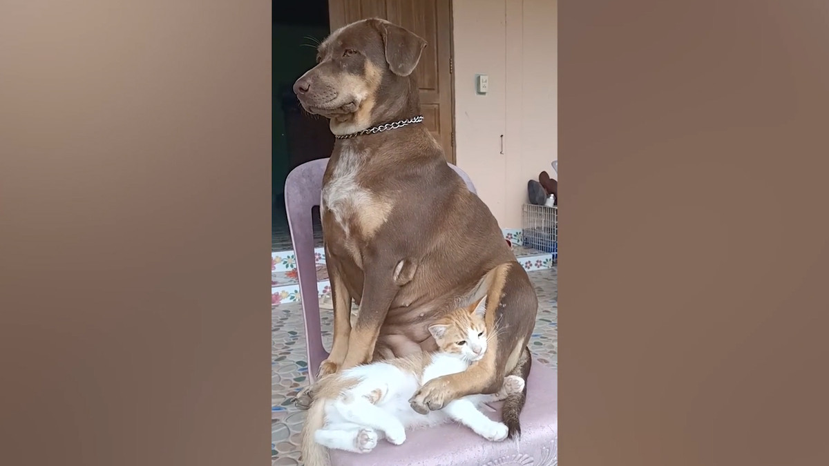 Chú mèo 6 tháng tuổi tên Money tại tỉnh Surin, Thái Lan thường đeo bám, ôm ấp chú chó bạn thân khiến chủ nhân cũng phải ghen tị.