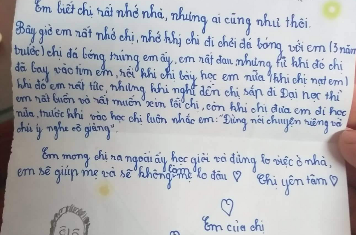 Bức thư của một cậu bé tiểu học gửi cho chị gái khi chuẩn bị lên Hà Nội nhập học đã phần nào khắc họa rõ hơn về sự tuyệt vời của việc có một người em. Hình ảnh bức thư được người chị gái bất ngờ tìm lại sau hai năm và quyết định chia sẻ lại trên mạng xã hội.