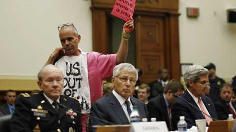 | Người dân Mỹ phản đối can thiệp quân sự vào Syria trong phiên điều trần tại Quốc hội hôm 4/9. Tham gia điều trần trước Tiểu ban đối ngoại Thượng viện có tướng Martin Dempsey - tổng tham mưu trưởng quân lực, Bộ trưởng quốc phòng Chuck Hagel và Ngoại trưởng John Kerry (từ trái sang) - Ảnh: Reuters |