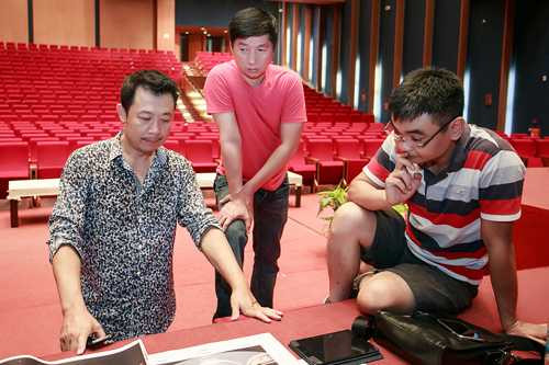 | Âm thanh ánh sáng sân khấu được các chuyên gia Hollywood chịu trách nhiệm. Vân Sơn trực tiếp kiểm tra từng chi tiết nhỏ trước giờ biểu diễn. |