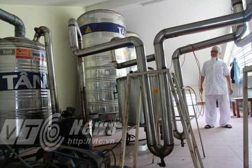 Dược sĩ Long mở cửa tầng tum rộng mấy chục mét vuông. Trong căn phòng ấy là một hệ thống máy móc phức tạp, với những ống dẫn chạy khắp nơi.