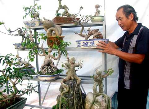 Mất 10 năm tìm tòi, nghệ nhân cây cảnh Nguyễn Viết Đính (TP Tuy Hòa, Phú Yên) đã lập được quy trình cơ bản tạo dáng bonsai tượng hình - loại nghệ thuật mới thử thách trí tưởng tượng và lòng kiên nhẫn của người chơi. Tại Hội hoa xuân năm nay, gian hàng bonsai tượng hình của ông không "đụng hàng" bất kỳ ai.
