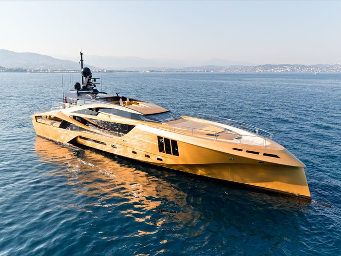 Xuất hiện tại Triển lãm Du thuyền Monaco hồi tháng 9 vừa qua, Khalilah gây ấn tượng với lớp vỏ ngoài dát vàng bóng loáng. (Ảnh: SuperYachtsMonaco)