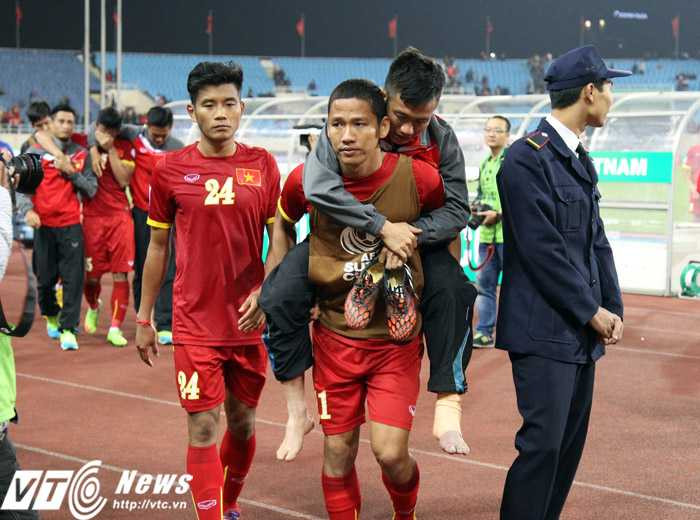 | Tấn Tài và Anh Đức không thể lên tuyển vào phút trót khiến lực lượng của ĐTVN thêm mỏng. |