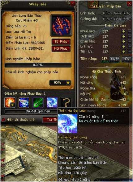 Ngoài kỹ năng đầu tiên Cộng Minh tăng 20 điểm toàn bộ thuộc tính, “Pháp bảo cực phẩm Lung Linh Bảo Tháp” còn có 3 chiêu tấn công cực kỳ độc, có thể thao túng đối phương đó là: Thiên hạ đại loạn, Hàng yêu phục ma và Như ý trảm.
