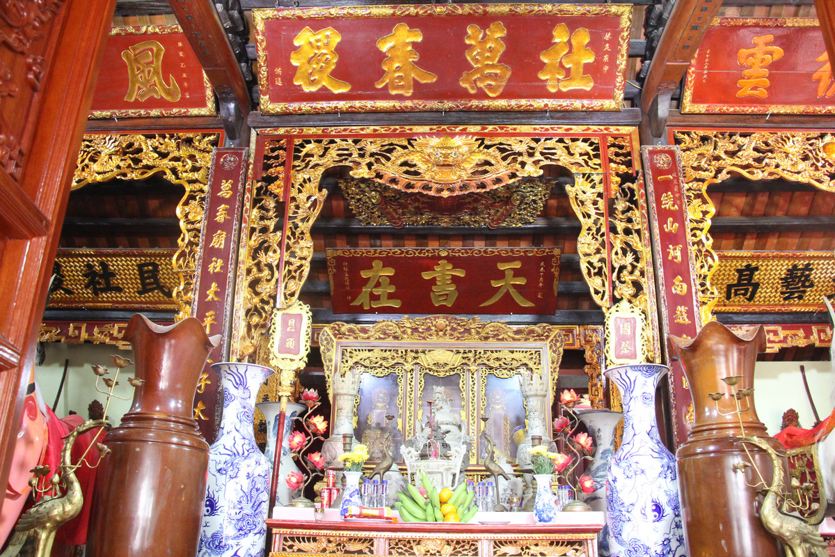 Ông Trần Khánh Toàn - thành viên Ban bảo vệ di tích cho biết, điều đặc biệt, trên khám thờ (bên trong đặt 3 chiếc mũ đồng và long bào, đôi hài của Đức Vua) và nơi thờ các quần thần treo bức đại tự với 3 chữ Thiên Thư Tại (có nghĩa là Sách Trời ở đây).