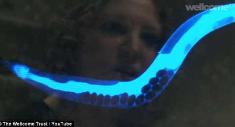 Đối với loài giun, "thần chết" lấy đi mạng sống của động vật có thể dễ dàng quan sát dưới kính hiển vi khi một dải sóng huỳnh quang màu xanh dương dịch chuyển qua ruột của nó.