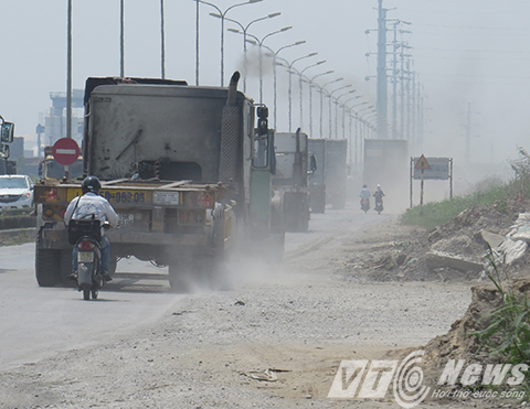 | Những luồng đất cát bụi mù mịt cuốn theo từng đoàn xe bao phủ tuyến tuyến đường |