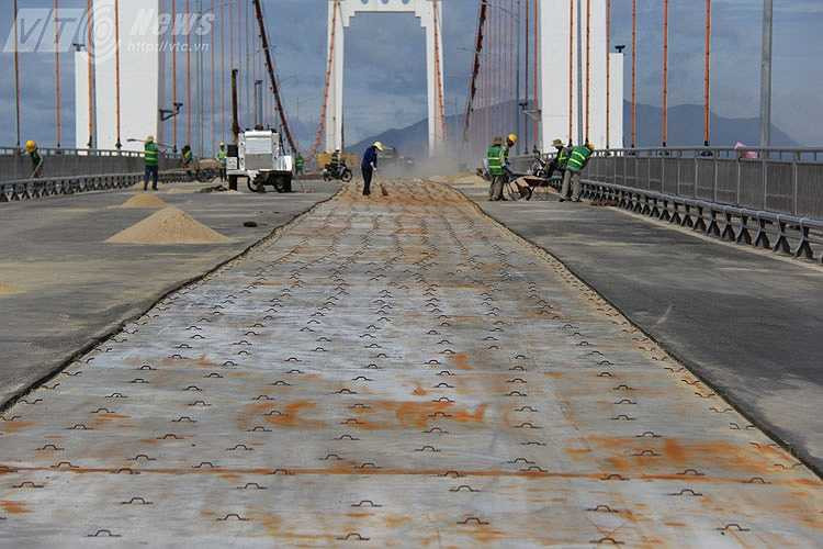 Được biết, bên cạnh đai thép neo hàn với bản thép mặt cầu, lớp phủ mặt cầu cũng được gia cường bằng lớp sợi thủy tinh ở giữa 2 lớp bê tông nhựa Polyme dày 4cm và 3cm.