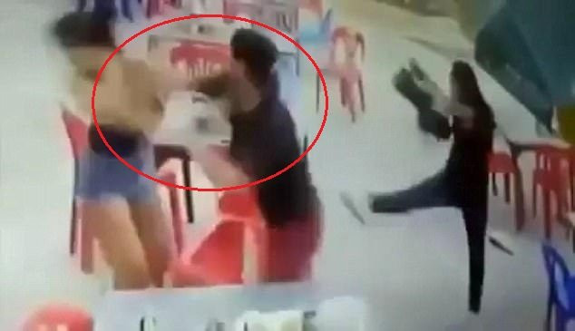 Cô gái bực tức hất ly nước đáp trả khiến anh ta tức giận, đánh tới tấp vào mặt và người cô. Bạn cô gái lao vào giúp cũng bị anh ta bóp cổ.