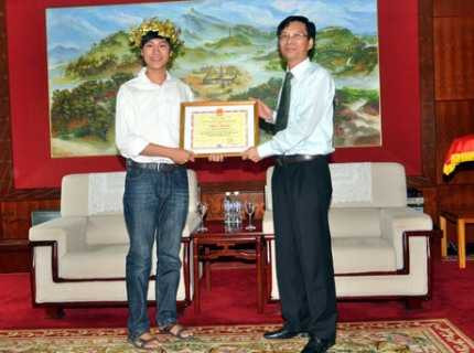 Nhân dịp này, Chủ tịch UBND tỉnh đã trao tặng bằng khen của UBND tỉnh và phần thưởng trị giá 10,5 triệu đồng cho Đặng Thái Hoàng.