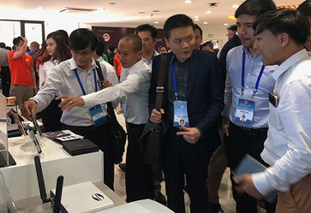 Các nhà khoa học tìm hiểu sản phẩm công nghệ giới thiệu tại Khu phần mềm F-Ville 2 (Ảnh: Trung tâm Nghiên cứu và Phát triển truyền thông KH&CN)