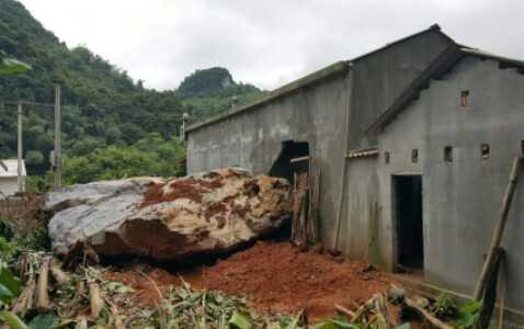 Sạt lở nghiêm trọng đã khiến một tảng đá lớn nặng chừng 20 tấn rơi vào ngôi nhà của ông Mông Văn Đức (thôn Nà Bảnh, xã Xuân Mai, huyện Văn Quan, tỉnh Lạng Sơn) làm bức tường nhà chính thủng lỗ lớn, toàn bộ mái bếp đổ sụp...