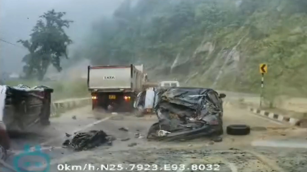 Mưa lớn kéo dài gây sạt lở ở Nagaland, Ấn Độ khiến những tảng đá khổng lồ từ trên núi đổ sập xuống đè bẹp hai chiếc ô tô.