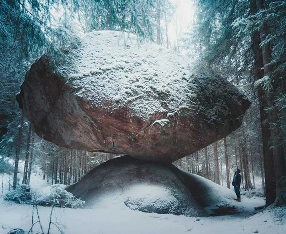 Tảng đá khổng lồ Kummakivi ở Phần Lan nằm chênh vênh như sắp lăn xuống nhưng vẫn đứng vững suốt hàng nghìn năm.