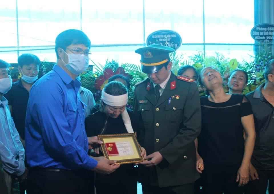Phó Bí thư Tỉnh đoàn Nghệ An trao huy hiệu Tuổi trẻ dũng cảm của Trung ương Đoàn TNCS Hồ Chí Minh cho thân nhân Đại úy Nghĩa.