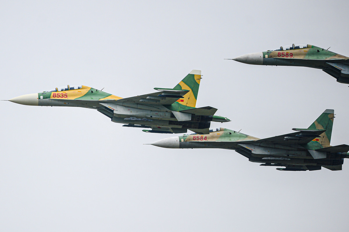 Phi đội tiêm kích Su-30MK2 bay huấn luyện chuẩn bị cho khai mạc Triển lãm Quốc phòng quốc tế Việt Nam 2024.