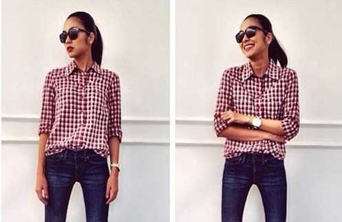 Sơmi cắm thùng quần jeans dáng skinny luôn là set đồ giúp chúng ta ghi điểm bởi sự năng động, cá tính. Nhưng với Hà Tăng, nó lại làm lộ rõ vóc dáng mảnh khảnh quá mức của cô.