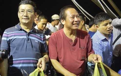![]() Bộ trưởng TT-TT Trương Minh Tuấn và Phó chủ tịch tỉnh Quảng Bình Trần Tiến Dũng chọn mua mỗi người 2 con cá ngừ của ngư dân vào tối 30/4. Ảnh: Hoàng Như. |