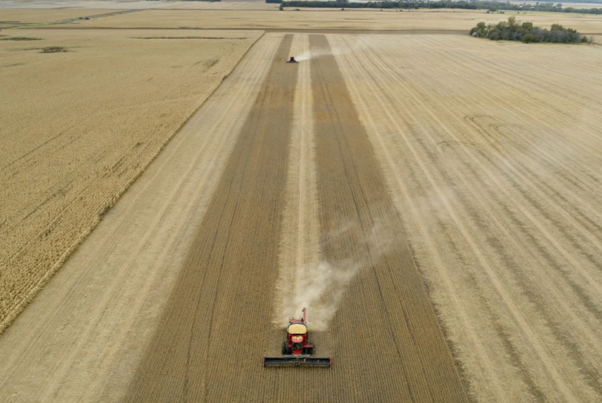 Một máy gặt đập liên hợp thu hoạch đậu nành ở bang Illinois, Mỹ. (Ảnh: Bloomberg)