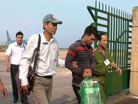| Đối tượng Vũ (áo sọc) được dẫn giải về Quảng Bình phục vụ công tác điều tra. |