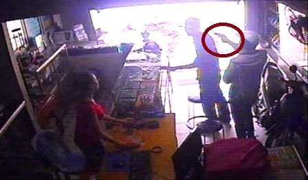 Sau một lúc cầm chiếc điện thoại Iphone 5 lên xem và trả giá, thanh niên bỏ ra ngoài. Bất ngờ, thanh niên lao nhanh vào quán rồi móc từ túi nylon ra khẩu súng lên đạn khống chế người khách quen của chị Dung rồi cướp chiếc iphone5 bỏ chạy ra đường.