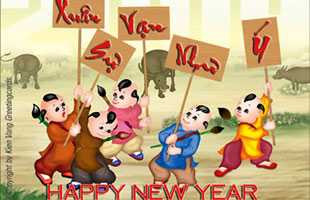 Năm mới 2010: Chúc luôn hoan hỉ, sức khỏe bền bỉ, công danh hết ý, tiền vào bạc tỉ, tiền ra ri rỉ, tình yêu thỏa chí, vạn sự như ý, luôn cười hi hi, cung hỷ cung hỷ...