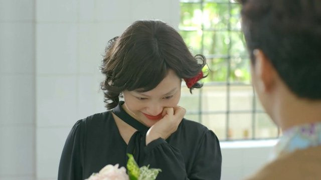Diệu ngượng ngùng khi nhận hoa của chồng cũ trong ngày sinh nhật.