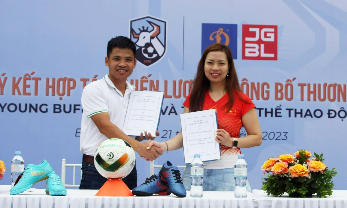 Bà Văn Thanh Thuý - Trưởng phòng Phát triển Dự án, Thư ký Chủ tịch HĐQT kiêm TGĐ Tập đoàn thể thao Động Lực cùng đại diện Trung tâm bóng đá YOUNG KIDS ký kết hợp tác.