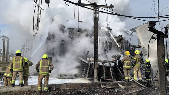 Lực lượng cứu hỏa Ukraine dập lửa tại một cơ sở hạ tầng năng lượng bị hư hại do một cuộc tấn công tên lửa ở vùng Rivne.