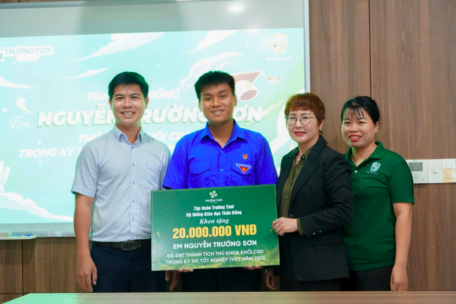 Với mong muốn khuyến khích tinh thần hiếu học và tiếp thêm động lực cho thế hệ trẻ trên con đường chinh phục tri thức, Tập đoàn Trường Tươi cùng Hệ thống Giáo dục Thần Đồng (đơn vị trực thuộc Tập đoàn) đã trao tặng học bổng khuyến học cho em Nguyễn Trường Sơn, thủ khoa khối C00 trong kỳ thi THPT năm 2025 tại tỉnh Đồng Nai.