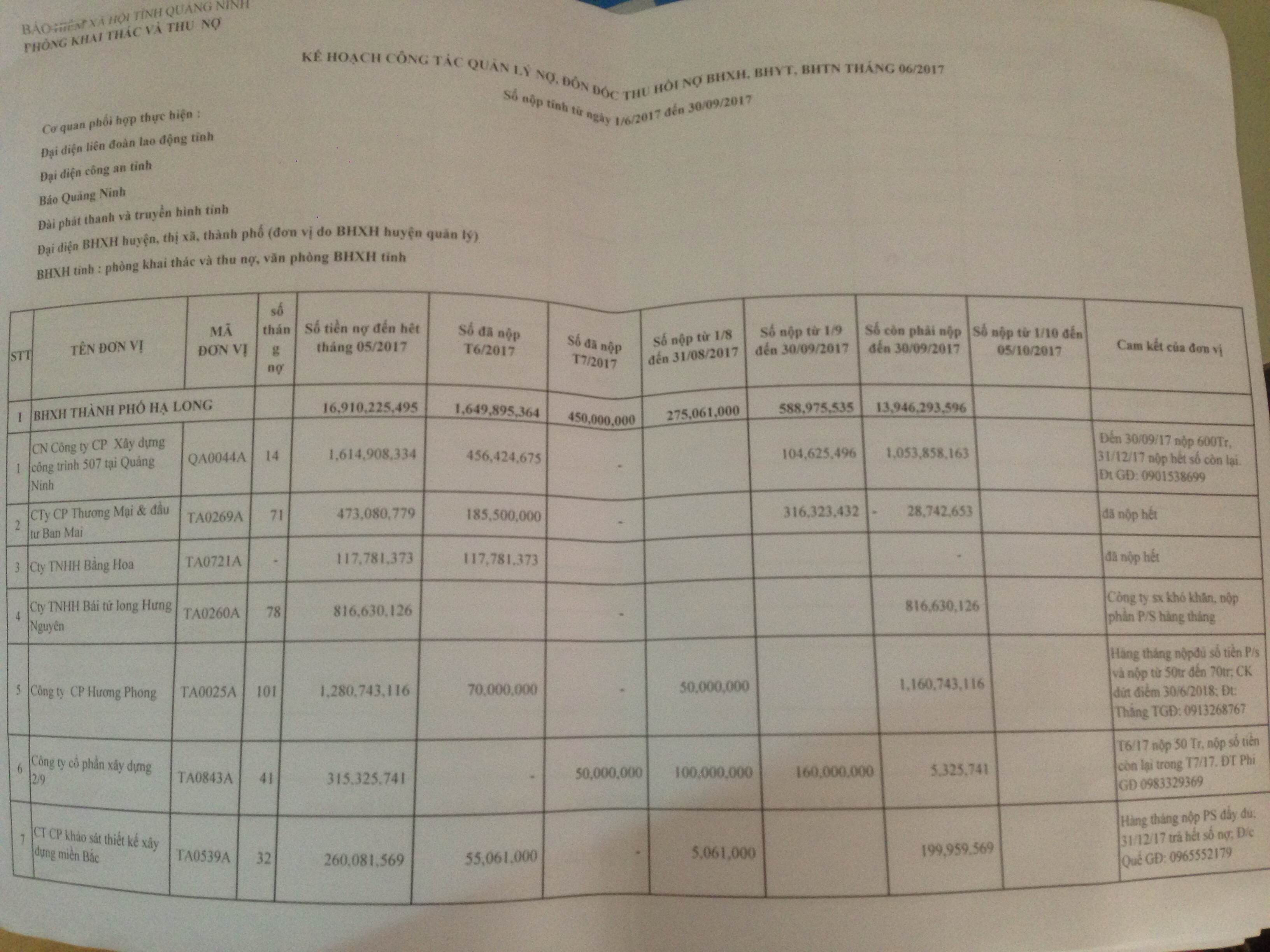 Danh sách các đơn vị nợ bảo hiểm xã hội kéo dài (tính đến hết tháng 5/2017) là Công ty TNHH Âu Lạc Quảng Ninh (Tập đoàn Tuần Châu), với số tiền lên tới trên 10 tỷ đồng, thời gian nợ 26 tháng; Công ty Cổ phần xi măng và xây dựng Quảng Ninh nợ gần 7 tỷ đồng, thời gian nợ 7 tháng; Công ty Cổ phần may Quảng Ninh với số tiền trên 5 tỷ đồng, thời gian nợ 12 tháng...