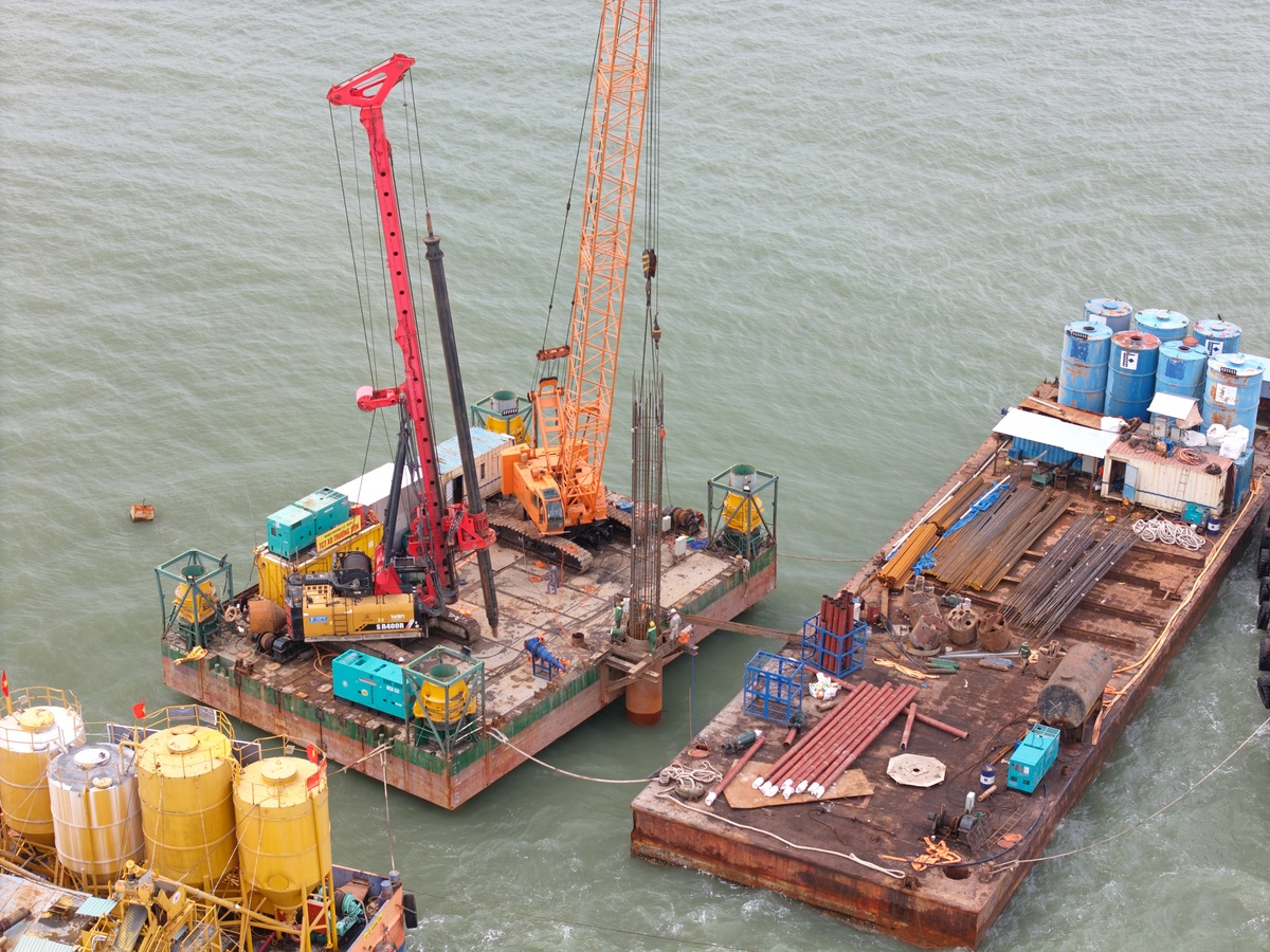 Tại khu vực ngoài biển, công trường cũng diễn ra sôi động không kém. Đơn vị thi công huy động tàu tải trọng lớn kéo sà lan hệ nổi Zack-up để phục vụ khoan thủy lực và thi công các mũi cọc ngoài khơi.