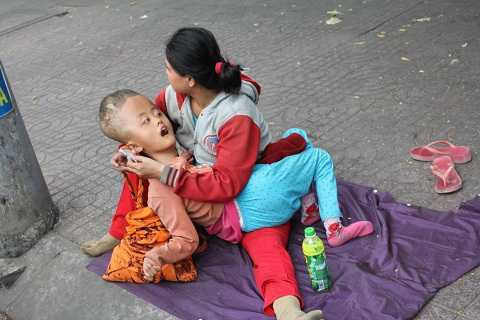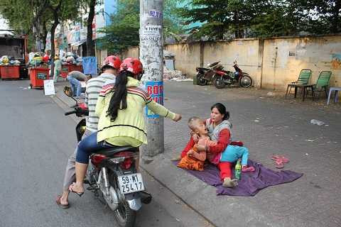 | Chiều 28 Tết, chị Nguyễn Thị Hồng Loan (quê Thừa Thiên Huế) bế đứa con bị bệnh não ứ nước ngồi bán vé số trên đường Lý Thường Kiệt. |