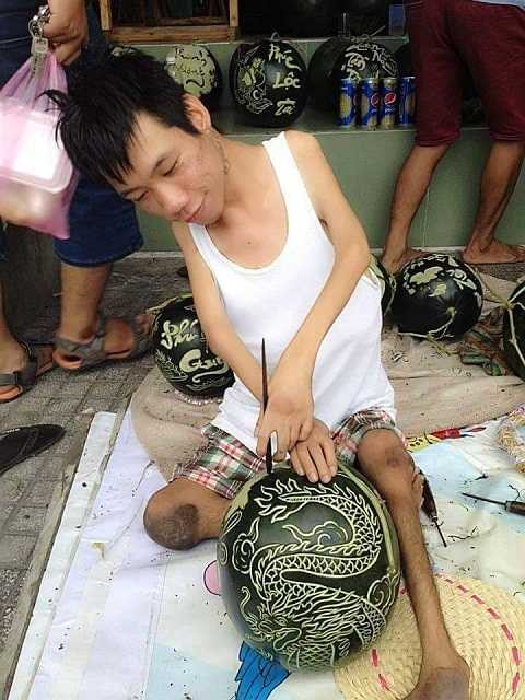 Cậu thanh niên này dù có đôi chân tật nguyền nhưng lại rất khéo léo. Tranh thủ người dân mua dưa hấu về cúng Tết, cậu dùng dụng cụ khắc hoa văn lên vỏ dưa để bán kiếm tiền.