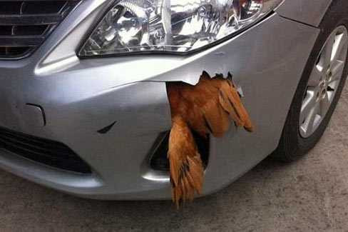 | Vụ tai nạn hy hữu giữa chiếc Toyota Corolla và một con gà tại Trung Quốc. |