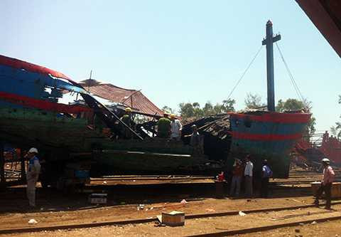 | Tàu cá QNa 91918TS bị cháy khi đang trên đà sửa chữa |
