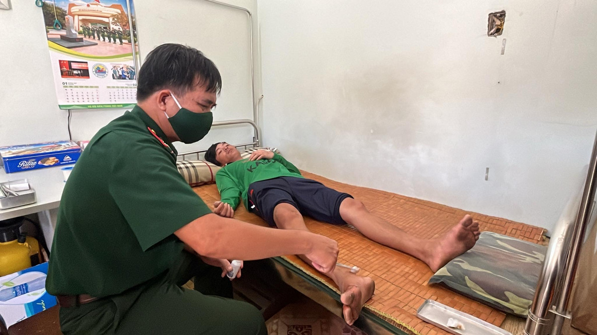 Một trong 9 thành viên trên tàu cá BV 97209 TS gặp nặn đang được chăm sóc sức khoẻ tại Đồn Biên phòng Bến Đá.
