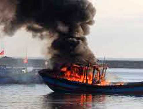 | Tối 10/6, chiếc tàu cá QNg 96084 TS của ngư dân Lý Sơn bị cháy đã được lai kéo về bờ |
