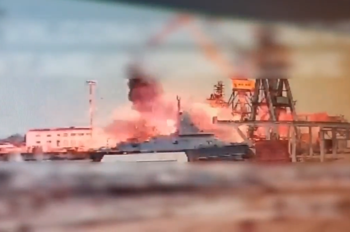 Tàu hộ vệ Askold neo tại nhà máy đóng tàu Zaliv ở Kerch bị tên lửa Ukraine tập kích hôm 4/11. (Nguồn: The Drive)