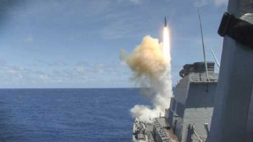 | Tàu USS Curtis Wilbur của Hải quân Mỹ trong một lần phóng tên lửa |